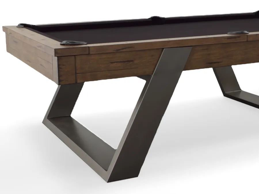 The Modesto Pool Table is crafted from beautiful Solid Maple and dressed in a rich Whiskey finish. It presents a clean, simple, and sturdy design that easily anchors any modern or transitional game room. This robust construction is designed to provide long-lasting stability and a superior playing surface for tournament-level play.