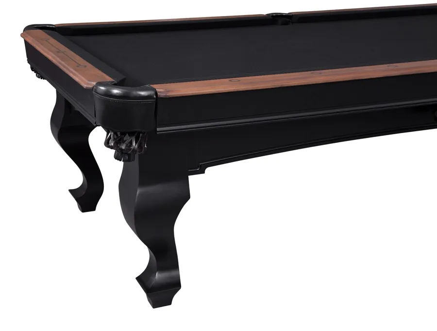 The Teton Pool Table blends rustic charm with robust construction, featuring beautiful Solid Black Walnut Hardwood rails and aprons. It is designed with double main beam construction for ultimate stability and features inlaid Black Walnut round sites. Finished in a distinct Black and Tumbleweed combination, this table is a true centerpiece built for a lifetime of play.