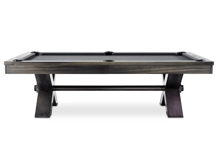 The championship quality playing surface is dramatically grounded by Vox’s X-shaped steel base. The Universal Steel Floor Rack from Plank & Hide is a perfect companion to any of the Industrial Series Pool Tables, elevating both function and form- adding a touch of industrial charm to any game room. The rubber-lined cue holders securely hold cues in place when not in use. A hook provides storage for a pool triangle rack, and with slots designed to hold 8 pool balls, it keeps everything organized and accessible.